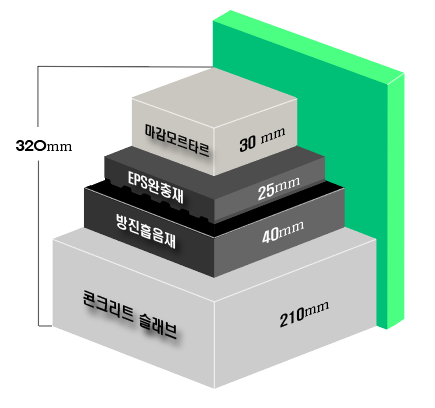 슬래브210 + 방진흡음시트40 +EPS완충재25 + 마감몰탈45 = 표준320